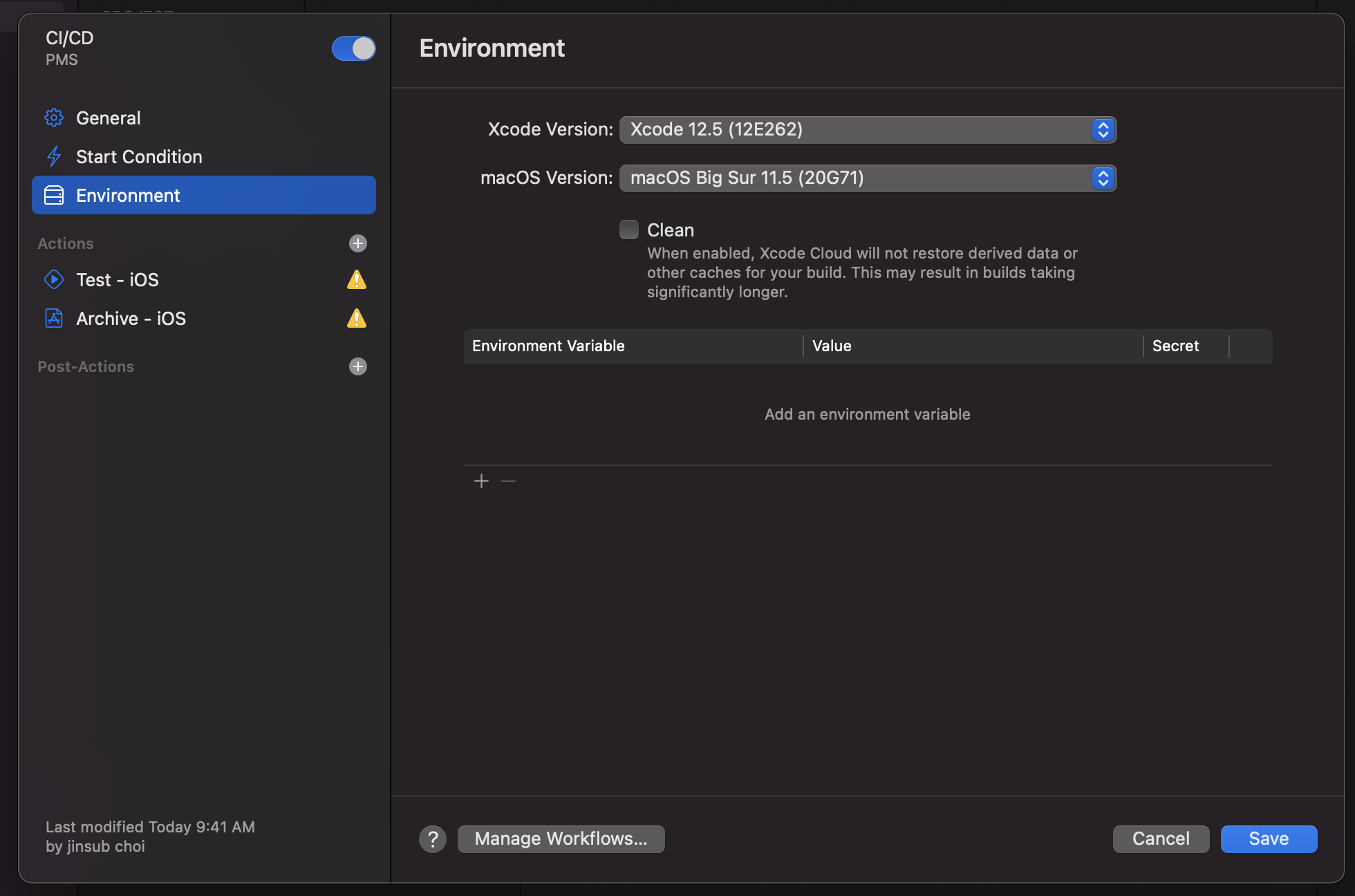 커스텀 환경 변수는 Workflow의 Environment 부분에서 추가/삭제할 수 있습니다.