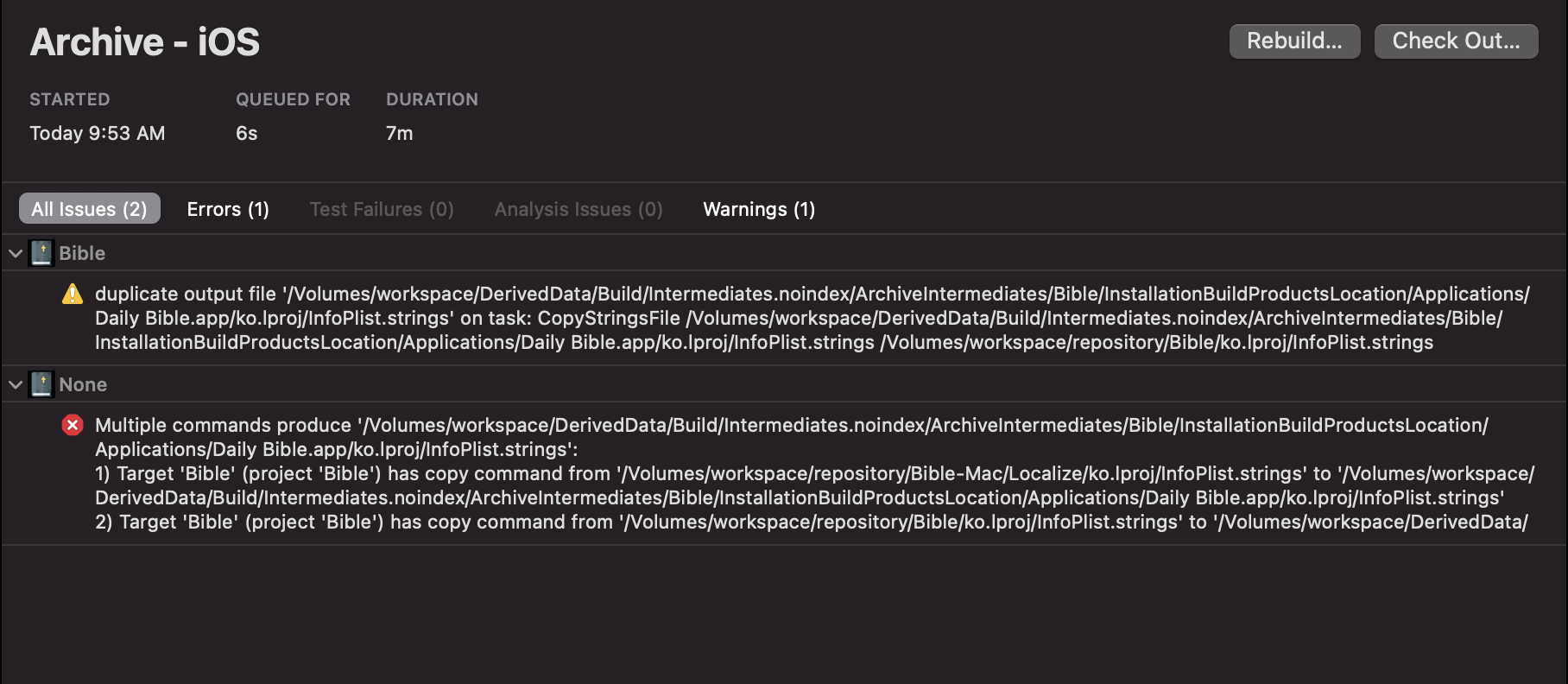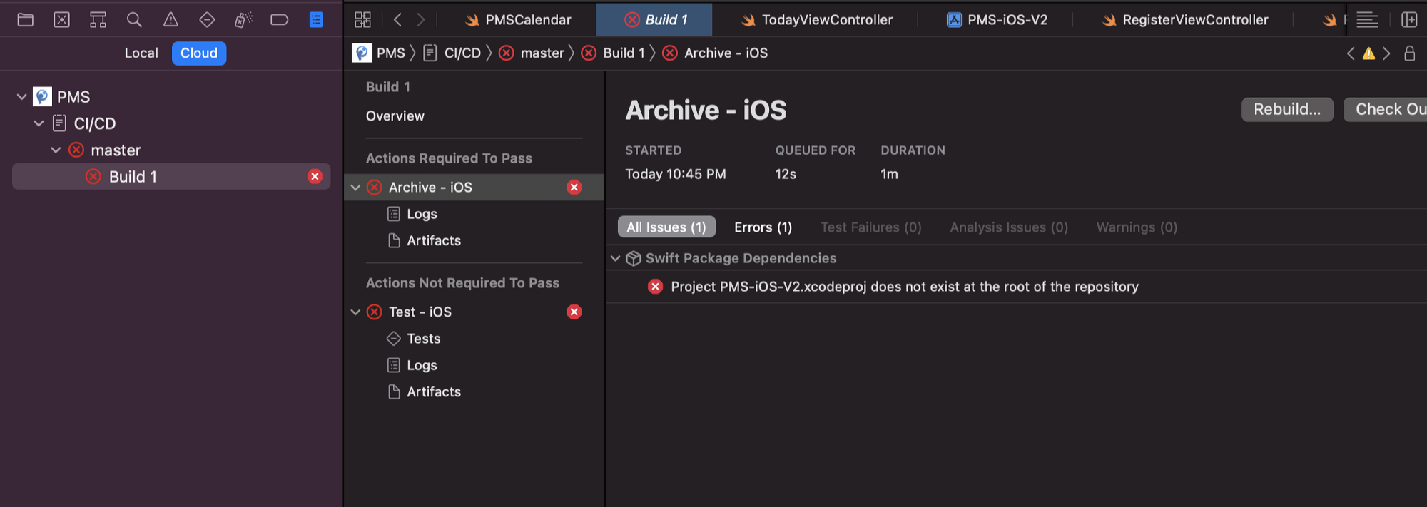 에러가 아래처럼 표시되지만, 안타깝게도 Xcode에서는 복사가 되지 않아 저는 App store connect에서 앱의 Xcode Cloud에 들어가서 오류 메세지를 복사해서 오류를 고쳤습니다.