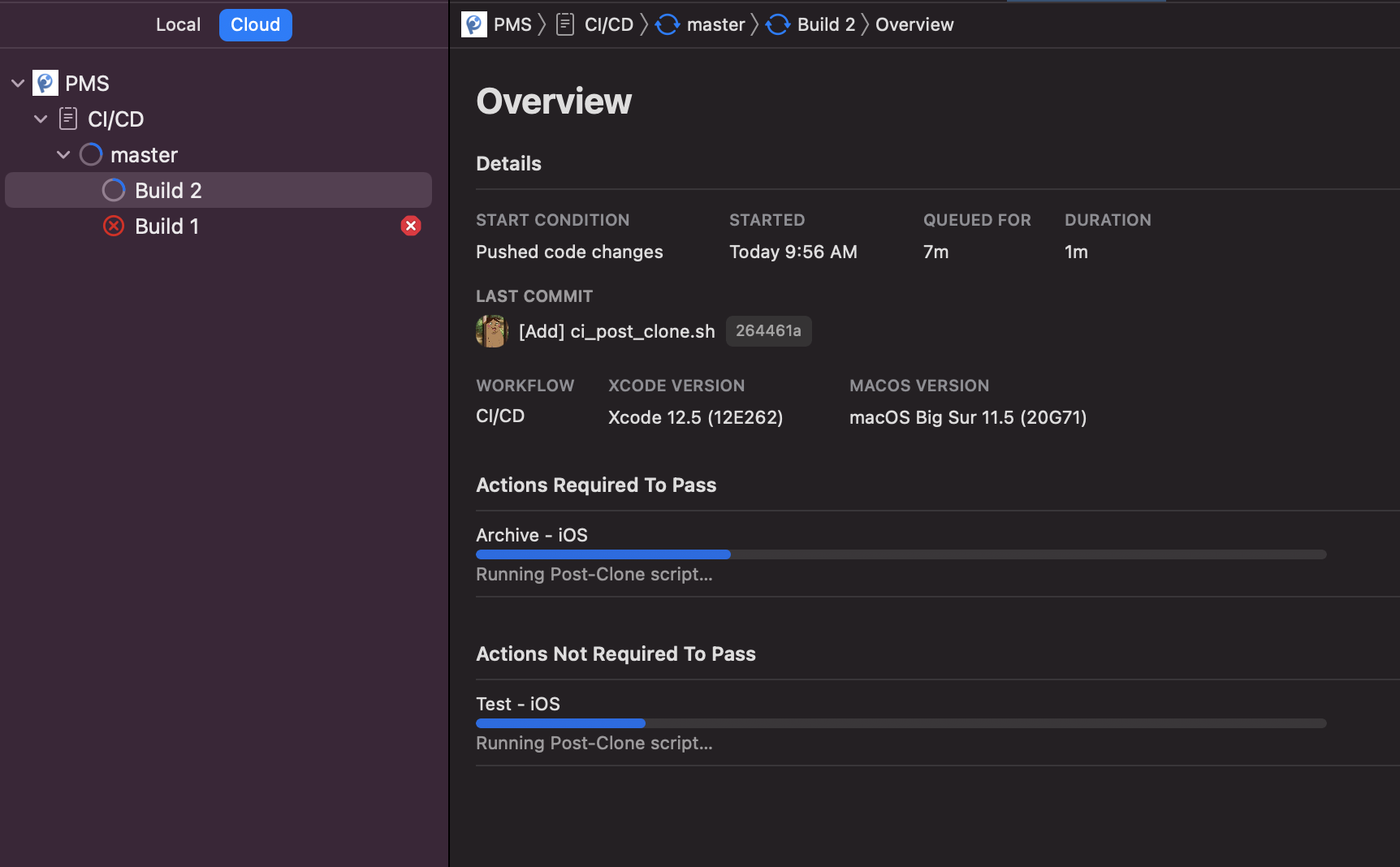 그렇게 환경변수도 설정한 후 깃허브에 ci_post_clone.sh을 커밋하고 결과를 기다리는 중입니다. github actions를 썼을 때보다 더 오래 걸리네요.